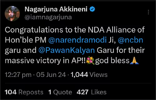 ఆంధ్రప్రదేశ్ లో జరిగిన ఎన్నికల్లో తెలుగుదేశం, జనసేన, బిజెపీ నేతృత్వంలోని ఎన్ డి ఏ కూటమి విజయ బావుటా ఎగరవేసింది. భారతదేశం మొత్తం నివ్వెరపోయేలా రికార్డు విజయాన్ని నమోదు చేసింది. మొత్తం 175 స్థానాలకి గాను 164 స్థానాల్లో ఘన విజయాన్ని సాధించింది. దీంతో నాగ్ ట్విట్టర్ వేదికగా కూటమికి ధన్యవాదాలు తెలుపుతు తన ప్రతి స్పందని తెలియచేసాడు. ఎన్ డి ఏ కూటమికి నా శుభాకాంక్షలు అంటూ మోడీ(modi)చంద్రబాబు నాయుడు(chandrababu naidu)పవన్ కళ్యాణ్ (pawan kalyan)పేరు లని ప్రస్తావించాడు.