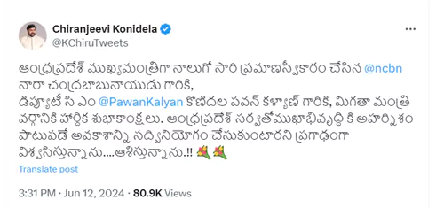 "ఆంధ్రప్రదేశ్ ముఖ్యమంత్రిగా నాలుగో సారి ప్రమాణస్వీకారం చేసిన నారా చంద్రబాబునా యుడు గారికి, డిప్యూటీ సీఎం కొణిదల పవన్ కళ్యాణ్ గారికి, మిగతా మంత్రి వర్గానికి హార్దిక శుభాకాంక్షలు. ఆంధ్రప్రదేశ్ సర్వతోముఖాభివృద్ధి కి అహర్నిశం పాటుపడే అవకాశాన్ని సద్వినియోగం చేసుకుంటారని ప్రగాఢంగా విశ్వసిస్తున్నాను....ఆశిస్తున్నాను.!!" అంటూ తాజాగా చిరంజీవి ట్వీట్ చేశారు. ఇప్పటికే డిప్యూటీ సీఎం అంటూ ట్విట్టర్ లో పవన్ పేరుని ట్రెండ్ చేస్తున్న మెగా ఫ్యాన్స్.. చిరంజీవి ట్వీట్ తో మరింత సంబరపడుతున్నారు.