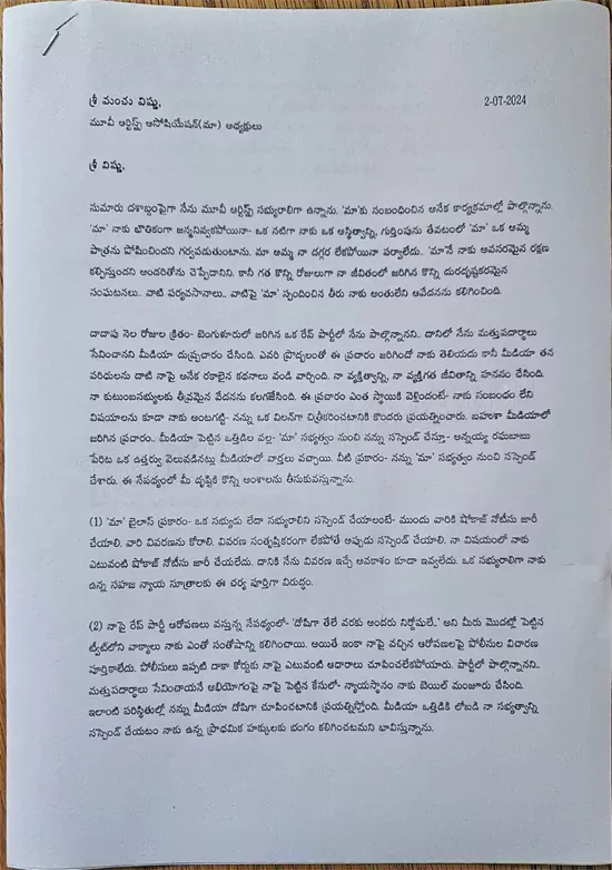 మే 19న బెంగళూరులో జరిగిన రేవ్ పార్టీ ఎంతటి కలకలం సృష్టించిందో అందరికీ తెలిసిందే. ఈ పార్టీలో వివిధ ప్రాంతాలకు చెందిన ఎంతో మంది యూత్తోపాటు పలువురు ప్రముఖులు కూడా పాల్గొన్నారు. ఈ పార్టీలో డ్రగ్స్ సరఫరా జరుగుతోందన్న సమాచారం అందుకున్న పోలీసులు జిఆర్ ఫామ్హౌస్పై దాడి చేసి 103 మంది అరెస్ట్ చేశారు. వారిలో టాలీవుడ్ నటి హేమ కూడా ఉండడంతో ఈ వార్త క్షణాల్లో వైరల్ అయిపోయింది. హేమ డ్రగ్స్ కేసులో అరెస్ట్ అయిందన్న వార్తపై ఎన్నో కథనాలు వెలువడ్డాయి. ఆ తర్వాత హేమ అరెస్ట్ కావడం, బెయిల్పై విడుదల కావడం జరిగింది. ఈలోగా మూవీ ఆర్టిస్ట్స్ అసోసియేషన్ ఈ విషయంపై స్పందిస్తూ హేమ సభ్యత్వాన్ని సస్పెండ్ చేసింది. పోలీసులు అరెస్ట్ చేసిన రోజు నుంచీ తాను నిర్దోషినని చెబుతూ వచ్చిన హేమ తాజాగా ‘మా’కు ఒక లెటర్ సమర్పించింది. ‘మా’ అధ్యక్షుడు మంచు విష్ణుకి ఆ లెటర్ను అందించింది.