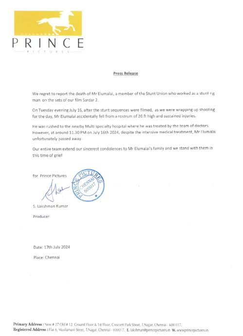 కార్తీ హీరోగా నటిస్తున్న 'సర్దార్ 2' సినిమా షూటింగ్ లో ప్రమాదం జరిగింది. ఈ ప్రమాదంలో స్టంట్ మ్యాన్ ఏలుమలై మృతి చెందారు. మూడు రోజుల క్రితమే 'సర్దార్ 2' షూటింగ్ స్టార్ట్ అయింది. చెన్నైలోని ప్రసాద్ ల్యాబ్ లో చిత్రీకరణ జరుగుతోంది. జూలై 16న యాక్షన్ సన్నివేశాలను చిత్రీకరించారు. ఈ క్రమంలో స్టంట్ మ్యాన్ ఏలుమలై ప్రమాదవశాత్తు 20 అడుగుల ఎత్తు నుండి కిందపడ్డారు. తీవ్ర గాయాల పాలైన స్టంట్ మ్యాన్ ను వెంటనే మూవీ టీం దగ్గరలోని హాస్పిటల్ కి తరలించింది. చికిత్స పొందుతూ జూలై 16 రాత్రి ఏలుమలై కన్నుమూశారు. ఏలుమలై మృతికి సంతాపం తెలిపిన మేకర్స్.. ఆయన కుటుంబానికి అండగా ఉంటామని ప్రకటించారు. అలాగే, స్టంట్ మ్యాన్ మృతి తో సినిమా షూటింగ్ ను వాయిదా వేశారు మేకర్స్.