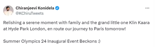 కాగా, మెగా కుటుంబం లండన్ నుంచి పారిస్ 2024 ఒలింపిక్స్ ప్రారంభ వేడుకకు వెళ్తోంది.