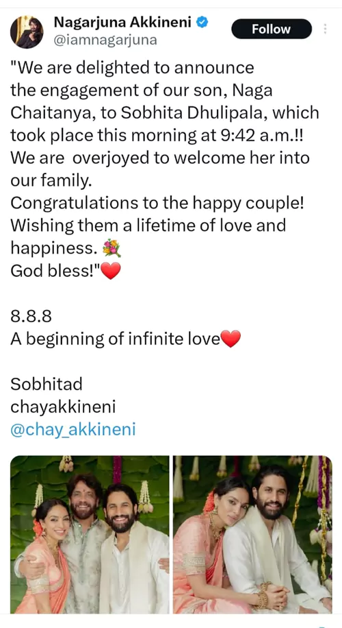 నాగ చైతన్య (Naga Chaitanya), శోభితా ధూళిపాళ (Sobhita Dhulipala) పెళ్లి వార్తలు నిజమయ్యాయి. చైతన్య, శోభితా నిశ్చితార్థం తాజాగా జరిగింది. ఈరోజు(ఆగష్టు 8) ఉదయం 9 గంటల 42 నిమిషాలకు తన కుమారుడు నాగ చైతన్య, శోభితా నిశ్చితార్థం జరిగినట్లు నాగార్జున ప్రకటించారు. ఎంగేజ్ మెంట్ ఫోటోలను సోషల్ మీడియా వేదికగా పంచుకున్నారు. శోభితను తమ కుటుంబంలోకి ఆహ్వానించడం ఎంతో సంతోషంగా ఉందని తెలిపారు. చైతన్య-శోభితా జంట జీవితాంతం సుఖసంతోషాలతో ఉండాలని నాగార్జున ఆశీర్వదించారు.