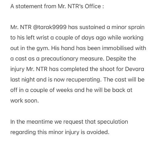 ఎన్టీఆర్ రోడ్డు ప్రమాదానికి గురయ్యారనే వార్తలతో అభిమానులు ఆందోళన చెందుతున్నారు. ఆయన త్వరగా కోలుకోవాలని కోరుకుంటున్నారు. అయితే అభిమానులు ఆందోళన చెందాల్సిన అవసరంలేదని, ఎన్టీఆర్ కి రోడ్డు ప్రమాదం అనే వార్తల్లో వాస్తవం లేదని ఆయన టీం తెలిపింది. "ఇటీవల జిమ్లో వర్కౌట్స్ చేస్తున్నప్పుడు ఎన్టీఆర్ ఎడమ మణికట్టు బెణికింది. గాయపడినప్పటికీ ఎన్టీఆర్ గత రాత్రి దేవర షూటింగ్ పూర్తి చేశారు. అది చిన్న గాయమే.. ఎవరూ ఆందోళన చెందవద్దు" అని టీం పేర్కొంది.