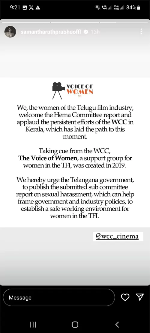 తెలుగు చిత్ర పరిశ్రమతో సమంత(samantha)కి ఉన్న అనుబంధం గురించి ప్రత్యేకంగా చెప్పుకోవాల్సిన పని లేదు. 2010 లో వచ్చిన ఏ మాయ చేసావే తో సాగిన సినీ ప్రస్థానం బాలీవుడ్ వరకు వెళ్లిందంటే సామ్ నట స్టామినా ని అర్ధం చేసుకోవచ్చు. రీసెంట్ గా మలయాళ చిత్ర పరిశ్రమలో మహిళా నటీమణులపై లైంగిక దాడులు జరుగుతున్నాయని నిర్దారించిన హేమ కమిటీ ని అభినందించిన సామ్ ఇప్పుడు సరికొత్త డిమాండ్ ని తెర మీదకి తీసుకొచ్చింది.