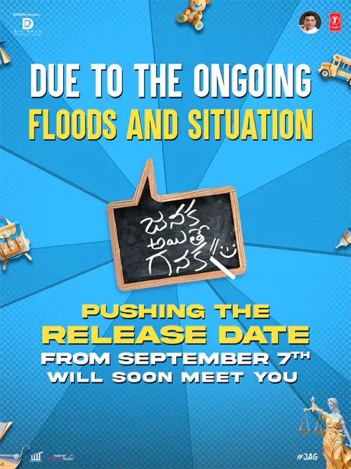 సుహాస్, సంగీర్తన జంటగా సందీప్ రెడ్డి బండ్ల దర్శకత్వంలో రూపొందించిన చిత్రం 'జనక అయితే గనక' (Janaka Aithe Ganaka). దిల్ రాజు ప్రొడక్షన్స్ నిర్మించిన ఫ్యామిలీ ఎంటర్టైనర్ సెప్టెంబర్ 7న రిలీజ్ కావాల్సి ఉంది. సెప్టెంబర్ 6న ప్రీమియర్స్ కూడా ప్లాన్ చేశారు. అయితే సడెన్ గా ఈ సినిమాని వాయిదా వేస్తున్నట్లు ప్రకటించి మేకర్స్ షాకిచ్చారు. వరదల కారణంగా తెలుగు రాష్ట్రాల్లో నెలకొన్న పరిస్థితుల దృష్ట్యా సినిమాని వాయిదా వేస్తున్నామని, కొత్త విడుదల తేదీని త్వరలోనే ప్రకటిస్తామని తెలిపారు.