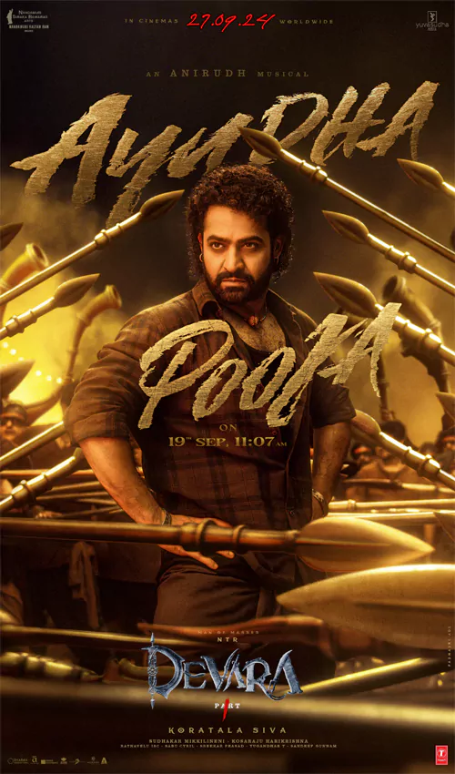 'దేవర' నుంచి నెక్స్ట్ 'ఆయుధ పూజ' (Ayudha Pooja) సాంగ్ రాబోతుందని, ఇది ఓ రేంజ్ లో ఉంటుందని కొద్దిరోజులుగా వార్తలొస్తున్నాయి. తాజాగా ఈ సాంగ్ విడుదల తేదీని తాజాగా చిత్రం బృందం ప్రకటించింది. రేపు(సెప్టెంబర్ 19) ఉదయం 11:07 కి ఫోర్త్ సింగిల్ గా 'ఆయుధ సాంగ్'ని విడుదల చేయనున్నట్లు తెలుపుతూ మేకర్స్ పోస్టర్ వదిలారు.