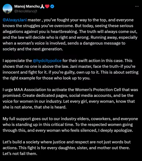 "జానీ మాస్టర్ మీరు ఎంతో కష్టపడి ఈ స్థాయికి వచ్చారు. మీపై ఇలాంటి ఆరోపణలు బాధగా ఉంది. ఇందులో నిజానిజాలు, తప్పుఒప్పులు చట్టాలు తేలుస్తాయి. ఒక మహిళకి సంబంధించిన ఈ కేసులో పారిపోవడం కరెక్ట్ కాదు. తప్పు చేయకపోతే న్యాయం కోసం పోరాడండి, తప్పు చేస్తే నిజం ఒప్పుకోండి. ఈ కేసులో వేగంగా స్పందించి చర్యలు తీసుకున్న హైదరాబాద్ సిటీ పోలీస్ కి నా అభినందలు. అలాగే, ఇచ్చిన మాట ప్రకారం ఉమెన్స్ ప్రొటెక్షన్ సెల్ ఏర్పాటు చేయాలని మూవీ ఆర్టిస్ట్స్ అసోసియేషన్ ను కోరుతున్నాను." అని మనోజ్ ట్వీట్ చేశాడు. అలాగే, మహిళల తరపున మనం పోరాడాలని, వారికి అండగా నిలబడాలని మనోజ్ పిలుపునిచ్చాడు.
