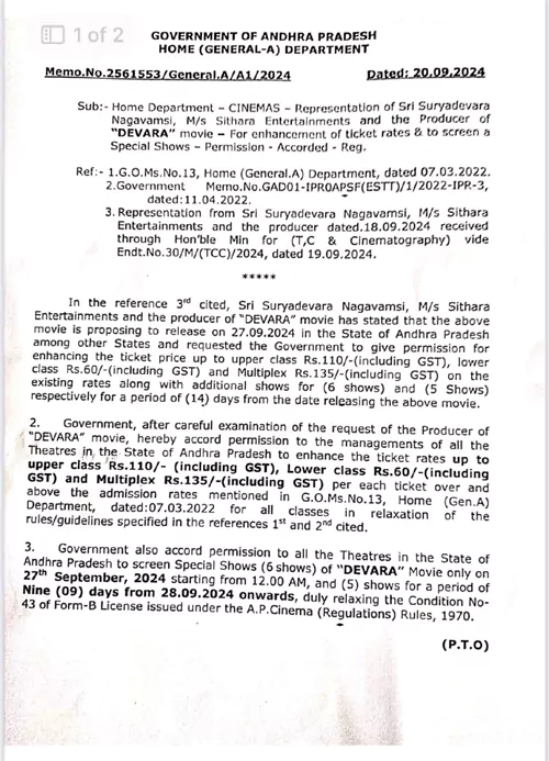 దేవర టికెట్ల ధరలని పెంచుకోవడానికి వీలుగా ఆంధ్ర ప్రదేశ్ ప్రభుత్వం ఒక జీవో జారీ చేసింది. మల్టీప్లెక్స్ లలో ఒక్కో టికెట్ పై నూట ముప్పై ఐదు రూపాయలు, సింగిల్ స్క్రీన్ థియేటర్లలో అప్పర్ క్లాస్ టికెట్ పై నూట పది రూపాయలు, లోయర్ క్లాస్ పై అరవై రూపాయిల వరకు పెంచుకోవడానికి అనుమతి ఇచ్చింది. రిలీజ్ రోజున పన్నెండు గంటల కి ప్రారంభం అయ్యే మిడ్ నైట్ షోతో పాటు మొత్తం ఆరు షో లు ప్రదర్శించుకునేందుకు వీలుగా కూడా గ్రీన్ సిగ్నల్ ఇచ్చింది. కాకపోతే ఆ మరుసటి రోజు నుంచి అంటే ఇరవై ఎనిమిదవ తేదీ నుంచి వరుసగా తొమ్మిది రోజుల పాటు రోజుకు ఐదు షోలు ప్రదర్శించుకోవచ్చని ఉత్తర్వులలో చెప్పింది. మరి పెరిగిన రేట్లతో దేవర రికార్డుల పరంగా ఎన్ని సంచలనాలు సృష్టిస్తుందో చూడాలి.