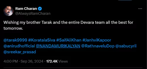 ఎన్టీఆర్ హీరోగా కొరటాల శివ దర్శకత్వంలో రూపొందిన 'దేవర' రేపు(సెప్టెంబర్ 27) థియేటర్లలో అడుగుపెట్టనుంది. ఈ నేపథ్యంలో చరణ్ ఆల్ ది బెస్ట్ చెబుతూ ట్వీట్ చేశాడు. "దేవర విడుదల సందర్భంగా నా సోదరుడు తారక్ కి మరియు టీం అందరికీ ఆల్ ది బెస్ట్" అంటూ చరణ్ ట్వీట్ చేశాడు. ఈ ట్వీట్ సోషల్ మీడియాలో వైరల్ గా మారింది.