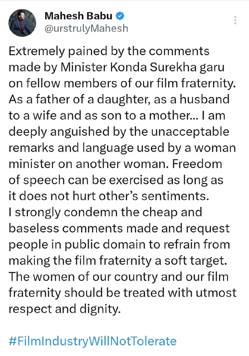 ఈ మేరకు తాజాగా మహేష్ బాబు(mahesh babu)కూడా 'ఎక్స్ ' వేదికగా ఒక ట్వీట్ చేసాడు.మంత్రి కొండా సురేఖ(konda surekha)గారు మా సినీ ప్రముఖులపై చేసిన వ్యాఖ్యలు చాలా బాధ కలిగించాయి. ఒక కూతురికి తండ్రిగా, భార్యకు భర్తగా, తల్లికి కొడుకుగా,ఒక బాధ్యతాయుతమైన పదవిలో ఉన్న మహిళా మంత్రి మరో మహిళపై చేసిన ఆమోదయోగ్యంకాని వ్యాఖ్యలు, భాష పట్ల తీవ్ర వేదనకు గురయ్యాను. ఎదుటివారి మనోభావాలను దెబ్బతీయనంత వరకు వాక్ స్వతంత్ర స్వేచ్ఛను ఉపయోగించుకోవచ్చు. కానీ పేరుతో ఆమె చేసిన చౌకబారు మరియు నిరాధారమైన వ్యాఖ్యలను నేను తీవ్రంగా ఖండిస్తున్నాను, మరియు సినీ వర్గాన్ని సాఫ్ట్ టార్గెట్గా మార్చుకోవద్దని పబ్లిక్ డొమైన్లోని వ్యక్తులను అభ్యర్థిస్తున్నాను. మన దేశంలోని మహిళలను మరియు మన సినీ సోదరులను చాలా గౌరవంగా చూడాలని ట్వీట్ లో పేర్కొన్నాడు.
