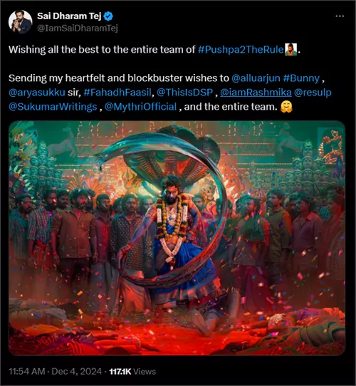 ఇక పుష్ప 2 గురించి ఇంతవరకు మెగా కాంపౌండ్ మాట్లాడటం గాని, ట్వీట్ కానీ చెయ్యలేదు.ఈ నేపథ్యంలో మెగా మేనల్లుడు సుప్రీం హీరో సాయి ధరమ్ తేజ్(sai dharam tej)సోషల్ మీడియా వేదికగా పుష్ప 2 బ్లాక్ బస్టర్ హిట్ ని అందుకోవాలంటూ బన్నీ,సుకుమార్(sukumar)లతో పాటు టీం మొత్తానికి ఆల్ ది బెస్ట్ చెప్పాడు.గత కొన్ని రోజులుగా మెగా అండ్ అల్లు అభిమానుల మధ్య వార్ జరుగుతున్న దృష్ట్యా ఇప్పుడు ఈ ట్వీట్ సినీ సర్కిల్స్ తో పాటు ప్రేక్షకుల్లో కూడా వైరల్ గా మారింది.