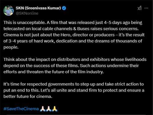 "కేవలం 4-5 రోజుల క్రితం విడుదలైన ఒక చిత్రం స్థానిక కేబుల్ ఛానెల్లు మరియు బస్సులలో ప్రసారం కావడం తీవ్ర ఆందోళన కలిగిస్తోంది. సినిమా అంటే కేవలం హీరో, దర్శకుడు లేదా నిర్మాతలు కాదు. ఇది 3-4 సంవత్సరాల కృషి, అంకితభావం మరియు వేలాది మంది కలల ఫలితం.