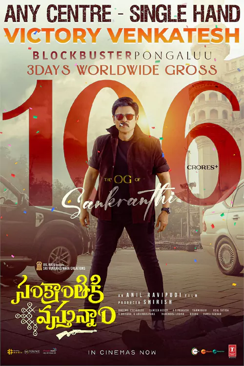 ఇక ఈ మూవీ కేవలం మూడు రోజులకే 106 కోట్ల గ్రాస్ ని రాబట్టింది.ఈ మేరకు చిత్ర యూనిట్ 'ది ఓజి ఆఫ్ సంక్రాంతి అంటూ ఒక పోస్టర్ ని కూడా రిలీజ్ చేసి తమ సంతోషాన్ని వ్యక్తం చేసింది.కేవలం రిలీజైన మూడు రోజులకే 100 కోట్ల క్లబ్ లో చేరడంతో రానున్న రోజుల్లో తెలుగు సినిమా చరిత్రలో 'సంక్రాంతికి వస్తున్నాం' సరికొత్త రికార్డులు సృష్టించడం ఖాయమనే మాటలు ట్రేడ్ సర్కిల్స్ లో వినిపిస్తున్నాయి.