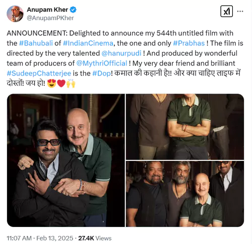 'ఫౌజీ'లో ప్రముఖ హిందీ నటుడు అనుపమ్ ఖేర్ (Anupam Kher) నటిస్తున్నారు. ఈ విషయాన్ని స్వయంగా ఆయనే సోషల్ మీడియా వేదికగా ప్రకటించారు. బాహుబలి ఆఫ్ ఇండియన్ సినిమా ప్రభాస్ తో తన 544వ సినిమా చేస్తున్నానని అనుపమ్ ఖేర్ తెలిపారు. టాలెంటెడ్ డైరెక్టర్ హను రాఘవపూడి దర్శకత్వంలో మైత్రి మూవీ మేకర్స్ నిర్మిస్తున్న ఈ సినిమాకి తన స్నేహితుడు సందీప్ ఛటర్జీ డీఓపీగా వర్క్ చేస్తున్నారని పేర్కొన్నారు. అలాగే ఈ చిత్ర కథ అద్భుతంగా ఉంటుందని అనుపమ్ రాసుకొచ్చారు. అంతేకాదు ఈ సందర్భంగా ప్రభాస్, హను, సందీప్ తో దిగిన ఫొటోలను కూడా పంచుకున్నారు. ఈ ఫొటోలలో ప్రభాస్ లుక్ ప్రత్యేక ఆకర్షణగా నిలిచింది. కొత్త హెయిర్ స్టైల్, కళ్ళద్దాలతో ప్రభాస్ స్టైలిష్ గా ఉన్నాడు.