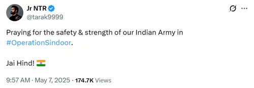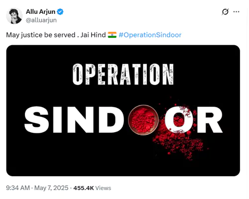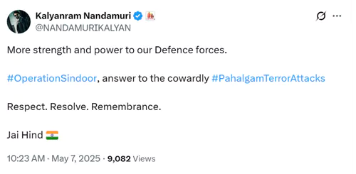 పలువురు సినీ ప్రముఖులు భారత్ సైన్యానికి మద్దతుగా సోషల్ మీడియా వేదికగా స్పందిస్తున్నారు. 'ఆపరేషన్ సిందూర్' ఫోటోని షేర్ చేసిన చిరంజీవి 'జై హింద్' అని రాసుకొచ్చారు. "న్యాయం జరుగుతోంది. జై హింద్" అని అల్లు అర్జున్ ట్వీట్ చేశాడు. "మన భారత సైన్యం యొక్క భద్రత మరియు బలం కోసం ప్రార్థిస్తున్నాను" అని జూనియర్ ఎన్టీఆర్ రాసుకొచ్చాడు. "పిరికి పహల్గామ్ టెర్రర్ దాడులకు సమాధానం ఆపరేషన్ సిందూర్." అని కళ్యాణ్ రామ్ ట్వీట్ చేశాడు.