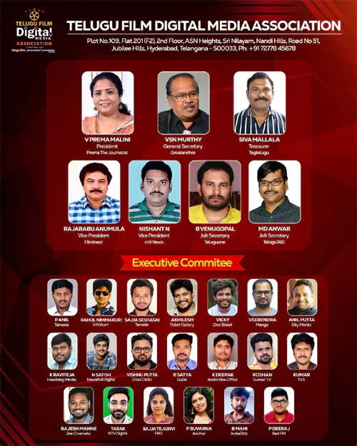 ఈ అసోసియేషన్ కార్యవర్గంలో అధ్యక్షులుగా వి ప్రేమ మాలిని, ప్రధాన కార్యదర్శిగా విఎస్ఎన్ మూర్తి, కోశాధికారిగా శివ మల్లాల, ఉపాధ్యక్షులుగా నిశాంత్ ఎన్, రాజబాబు అనుముల, సంయుక్త కార్యదర్శిగా బి వేణుగోపాల్, ఎండీ అన్వర్‌తోపాటు 30 మంది కార్యవర్గ సభ్యులు ఉణ్నారు.