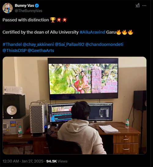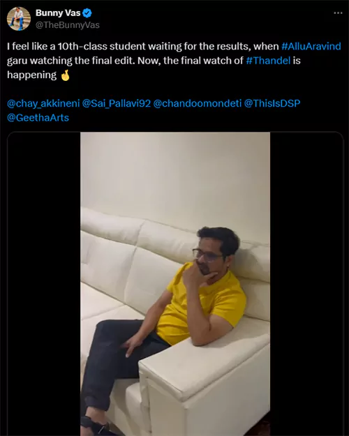 "తండేల్ ఫైనల్ ఎడిట్ ను అల్లు అరవింద్ గారు వీక్షిస్తున్నారు. ఫలితాల కోసం ఎదురుచూస్తున్న 10వ తరగతి విద్యార్థిలా నేను ఫలితం కోసం ఎదురుచూస్తున్నాను." అంటూ తండేల్ ఎడిట్ రూమ్ ఎదురుగా తాను కూర్చొని ఉన్న వీడియోను రీసెంట్ గా సోషల్ మీడియాలో షేర్ చేశారు బన్నీ వాసు. అనంతరం మూడు గంటల తర్వాత, "డిస్టింక్షన్ లో పాస్ అయ్యాను. అల్లు యూనివర్సిటీ డీన్ అల్లు అరవింద్ గారు సర్టిఫికేట్ ఇచ్చారు." అంటూ మరో పోస్ట్ పెట్టి తన సంతోషాన్ని పంచుకున్నారు. బన్నీ వాసు తాజా సోషల్ మీడియా పోస్ట్ ని బట్టి చూస్తే, అల్లు అరవింద్ కి ఈ సినిమా బాగా నచ్చిందని అర్థమవుతోంది.