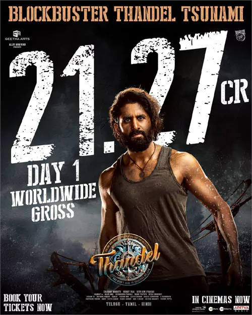 ఇక ఈ మూవీ మొదటి రోజు రికార్డు స్థాయిలో వరల్డ్ వైడ్ గా 21 .27 కోట్ల రూపాయిల కలెక్షన్స్ ని సాధించింది.ఈ మేరకు బ్లాక్ బస్టర్ 'తండేల్' సునామి అంటు చిత్ర బృందం అధికారకంగా ప్రకటించింది.చైతు కెరీర్ లోనే ఫస్ట్ టైం హయ్యస్ట్ గ్రాస్ సాధించిన మూవీ కూడా తండేల్ నిలిచింది. తండేల్ ముందు వరకు 'లవ్ స్టొరీ' సినిమా ఉండేది.ఇప్పుడు లవ్ స్టోరీ ని వెనక్కి నెట్టి 'తండేల్' ఫస్ట్ ప్లేస్ లో నిలిచింది.