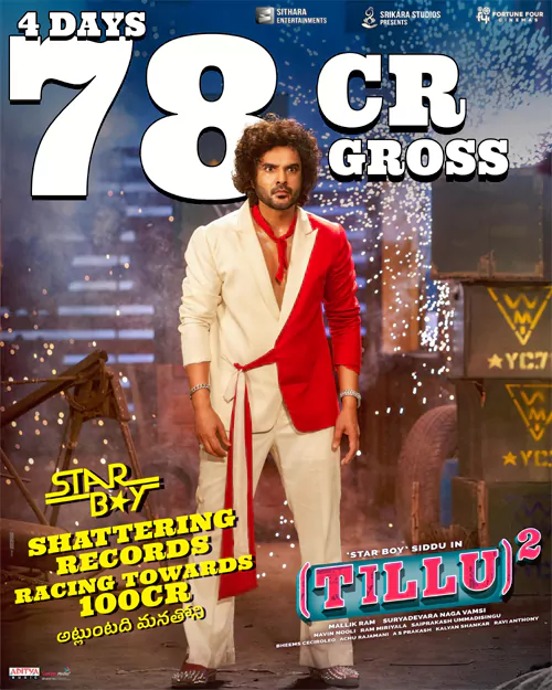 సిద్ధు జొన్నలగడ్డ(Siddhu Jonnalagadda), అనుపమ పరమేశ్వరన్(Anupama Parameswaran) జంటగా మల్లిక్ రామ్ దర్శకత్వంలో తెరకెక్కిన సినిమా 'టిల్లు స్క్వేర్'. సూపర్ హిట్ మూవీ 'డీజే టిల్లు'కి సీక్వెల్ గా రూపొందింది. సితార ఎంటర్టైన్మెంట్స్, ఫార్చ్యూన్ ఫోర్ సినిమాస్ సంయుక్తంగా నిర్మించిన ఈ సినిమా మార్చి 29న విడుదలై.. మొదటి షో నుంచే పాజిటివ్ టాక్ తెచ్చుకుంది. ఆ టాక్ కి తగ్గట్టే వసూళ్ల వర్షం కురిపిస్తోంది. మేకర్స్ ప్రకటించిన దాని ప్రకారం, మొదటి రోజు వరల్డ్ వైడ్ గా రూ.23.7 కోట్ల గ్రాస్, రెండో రోజు రూ.21.6 కోట్ల గ్రాస్, మూడో రోజు రూ.22.8 కోట్ల గ్రాస్ రాబట్టగా.. నాలుగు రోజు రూ.9.9 కోట్ల గ్రాస్ వసూలు చేసింది. దీంతో నాలుగు రోజుల్లోనే ప్రపంచవ్యాప్తంగా రూ.78 కోట్ల గ్రాస్ సాధించింది.