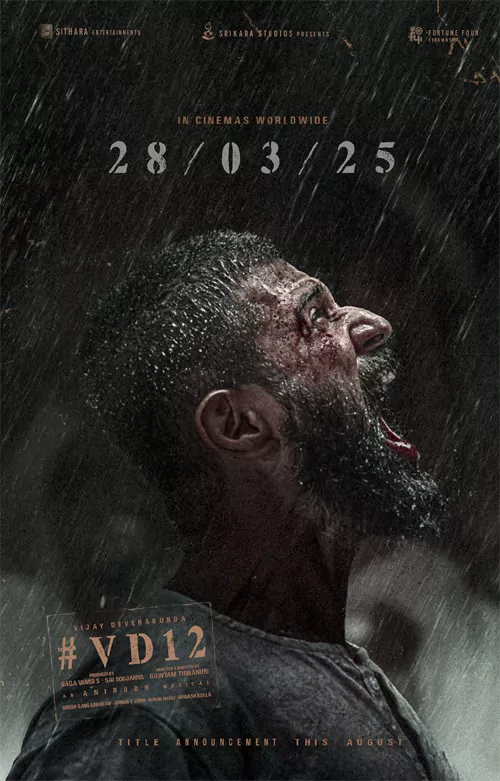 'VD 12' విడుదల తేదీని తాజాగా మేకర్స్ ప్రకటించారు. 2025, మార్చి 28వ తేదీన ప్రపంచవ్యాప్తంగా భారీ స్థాయిలో విడుదల చేయనున్నట్లు తెలిపారు. ఈ సందర్భంగా విడుదల చేసిన పోస్టర్ ఆకట్టుకుంటోంది. షార్ట్ హెయిర్, గుబురు గడ్డంతో ఉన్న విజయ్.. వర్షంలో తడుస్తూ గట్టిగా అరుస్తున్న పోస్టర్ అదిరిపోయింది.