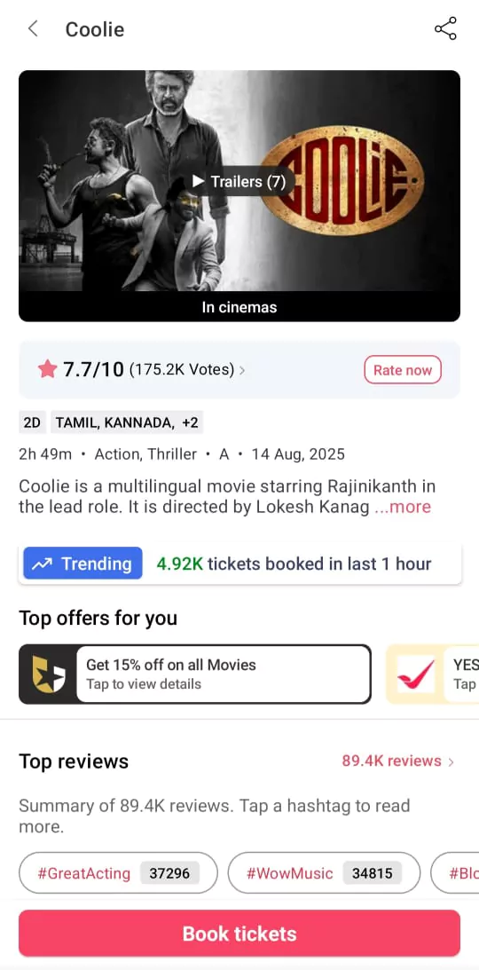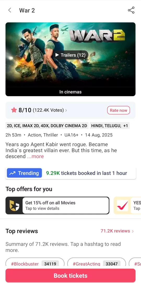 మంగళవారం నాడు బుక్ మై షోలో బుకింగ్స్ ని గమనిస్తే.. 'వార్-2' టికెట్లు గంటకు 9.2K బుక్ అవ్వగా, 'కూలీ' టికెట్లు మాత్రం 4.9K బుక్ అయ్యాయి. అంటే బుక్ మై షోలో 'కూలీ'కి దాదాపు రెట్టింపు స్థాయిలో 'వార్-2' టికెట్లు బుక్ అవుతున్నాయి. ఇదే ట్రెండ్ కొనసాగితే.. ఫుల్ రన్ లో 'కూలీ'కి 'వార్-2' షాకిచ్చినా ఆశ్చర్యంలేదు.