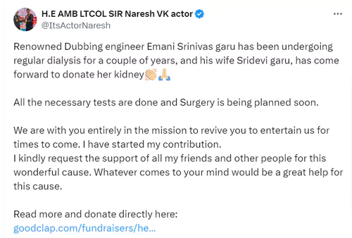 అనారోగ్యంతో బాధపడుతున్న ప్రముఖ డబ్బింగ్ ఇంజనీర్ శ్రీనివాస్ కి తన వంతుగా లక్ష రూపాయలు సాయం చేసిన నరేష్.. ఎవరికి తోచినంత సాయం వారు చేయండి అంటూ సోషల్ మీడియా వేదికగా కోరారు. "ప్రముఖ డబ్బింగ్ ఇంజనీర్ శ్రీనివాస్ గారు రెండేళ్లుగా రెగ్యులర్ డయాలసిస్ చేయించుకుంటున్నారు. ఆయన భార్య శ్రీదేవి గారు కిడ్నీ దానం చేసేందుకు ముందుకు వచ్చారు. అవసరమైన అన్ని పరీక్షలు పూర్తి చేసి త్వరలో సర్జరీకి ప్లాన్ చేస్తున్నారు. నేను నా వంతు సహకారం అందించాను. ఆయన త్వరగా కోలుకొని మనల్ని మళ్ళీ అలరించాలని కోరుకుంటున్నాను. నా స్నేహితులతో పాటు అందరూ తమకు తోచిన సాయం చేసి ఈ గొప్ప కార్యక్రమంలో భాగమవ్వాలని కోరుకుంటున్నాను." అని నరేష్ రాసుకొచ్చారు.