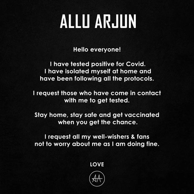 లేటెస్ట్గా కొవిడ్-19 బారిన పడిన వారిలో ఐకాన్ స్టార్ అల్లు అర్జున్ చేరాడు. ఈ విషయాన్ని తన సోషల్ మీడియా హ్యాండిల్ ద్వారా వెల్లడించాడు. బుధవారం తన ట్విట్టర్ హ్యాండిల్లో ఓ నోట్ను పోస్ట్ చేశాడు బన్నీ. "హలో ఎవిరివన్! నాకు కొవిడ్ పాజిటివ్గా నిర్ధారణ అయ్యింది. ఇంటిలో స్వీయ ఐసోలేషన్లోకి వెళ్లాను. అన్ని నియమ నిబంధనలను పాటిస్తున్నాను. నన్ను కాంటాక్ట్ అయినవాళ్లంతా టెస్ట్ చేయించుకోవాల్సిందిగా రిక్వెస్ట్ చేస్తున్నాను. ఇంట్లో ఉండండి, క్షేమంగా ఉండడి. అవకాశం లభించిన వెంటనే వాక్సిన్ వేయించుకోండి. శ్రేయోభిలాషులను, అభిమానులను నా గురించి వర్రీ అవ్వద్దని కోరుతున్నాను. ప్రస్తుతం నేను కోలుకుంటున్నాను. ప్రేమతో.. అల్లు అర్జున్" అంటూ ఆ నోట్లో రాసుకొచ్చాడు బన్నీ.