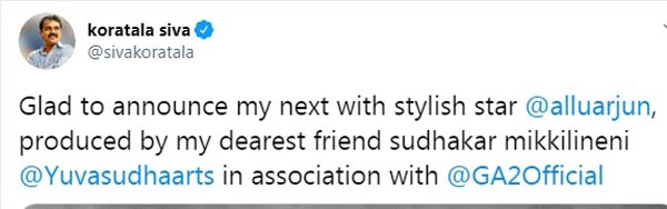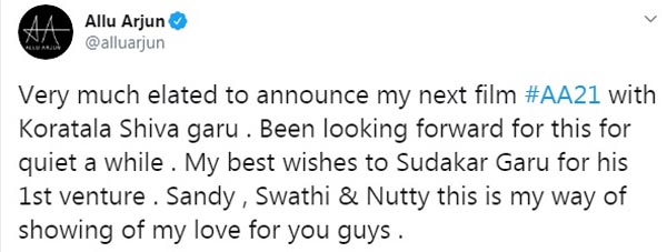 ఈ మూవీ ఎనౌన్స్మెంట్ సందర్భంగా అల్లు అర్జున్ తన ఆనందాన్ని ట్విట్టర్ ద్వారా పంచుకున్నాడు. "కొరటాల శివ గారితో నా తదుపరి ఫిల్మ్ AA21ను ప్రకటించడానికి చాలా సంతోషిస్తున్నాను. కొంత కాలం దీని కోసం క్వైట్గా ఎదురుచూస్తాను. సుధాకర్ గారి ఫస్ట్ వెంచర్ సందర్భంగా ఆయనకు బెస్ట్ విషెస్. శాండీ, స్వాతి, నట్టీ.. మీపై నా ప్రేమను ఇలా చూపిస్తున్నాను గైస్" అని ఆయన ట్వీట్ చేశాడు. కొరటాల శివ కూడా "నా తదుపరి చిత్రాన్ని స్టైలిష్ స్టార్ అల్లు అర్జున్తో ఎనౌన్స్ చేస్తున్నందుకు ఆనందిస్తున్నా" అని ట్వీట్ చేశారు.
