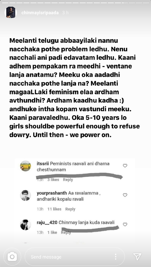 "మీలాంటి తెలుగు అబ్బాయిలకు నేను నచ్చకపోతే ప్రాబ్లమ్ లేదు. నేను నచ్చాలని పడి ఏడవడం లేదు. కానీ, అదేం పెంపకం రా మీది? వెంటనే 'ల...జ' అంటారు. మీకు ఒక ఆడది నచ్చకపోతే 'ల...జ' నా? మీలాంటి మగాళ్లకు ఫెమినిజం ఎలా అర్థం అవుతుంది? అర్థం కాదు కదా:) అందుకే, ఇంత కోపం వస్తుంది. కానీ, ఫర్వాలేదు. ఒక 5-10 ఏళ్లలో కట్నం ఇవ్వడానికి వ్యతిరేకంగా ఉండేలా అమ్మాయిలు శక్తివంతంగా మారతారు. అప్పటివరకు మేం శక్తిని పొందుతాం" అని చిన్మయి పేర్కొన్నారు. ఇన్స్టాగ్రామ్ స్టోరీస్ లో ఆమె ఈ పోస్ట్ చేశారు.