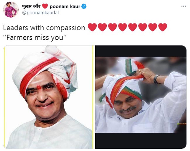 లేటెస్ట్గా తన ట్విట్టర్ హ్యాండిల్లో ఆమె షేర్ చేసిన పోస్టులు అందరి దృష్టినీ ఎట్రాక్ట్ చేస్తున్నాయి. రైతుల మాదిరిగా తలపాగా చుట్టిన దివంగత నేతలు నందమూరి తారకరామారావు, వై.ఎస్. రాజశేఖరరెడ్డి ఫొటోలను షేర్ చేసిన ఆమె, వాటికి "లీడర్స్ విత్ కంపాషన్.. ఫార్మర్స్ మిస్ యూ" అంటూ క్యాప్షన్ రాసింది. దాంతో పాటు అనేక రెడ్ హార్ట్ ఎమోజీలను జోడించింది. ఈ పోస్ట్ నెటిజన్లను బాగా ఆకర్షించింది. దాంతో వారు ఆ పోస్ట్ను షేర్ చేస్తూ దాన్ని వైరల్ చేశారు. ఆ పోస్ట్ తర్వాత మరో పోస్ట్ కూడా పెట్టింది పూనమ్.