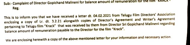 ఇప్పుడు లేటెస్ట్గా ప్రొడ్యూసర్ మధుపై డైరెక్టర్ గోపీచంద్ మలినేని డైరెక్టర్స్ అసోసియేషన్కు కంప్లయింట్ చేసిన విషయం వెలుగులోకి వచ్చింది. తనకు అగ్రిమెంట్ ప్రకారం ఇవ్వాల్సిన పూర్తి రెమ్యూనరేషన్ ఇవ్వలేదనీ, బ్యాలెన్స్ అమౌంట్ను ఇప్పించాలనీ ఆయన అసోసియేషన్ను కోరాడు. ఫిబ్రవరి 4న డైరెక్టర్స్ అసోసియేషన్ ఈ లెటర్ను ప్రొడ్యూసర్స్ కౌన్సిల్కు పంపింది. దీనికి డైరెక్టర్ అగ్రిమెంట్, రైటర్ అగ్రిమెంట్ను కూడా జత చేసింది. ఇప్పుడు దీనిపై ఎంక్వైరీ చేసి, తగిన చర్యలు తీసుకోవాల్సిన బాధ్యత ప్రొడ్యూసర్స్ కౌన్సిల్పై పడింది. క్రాక్ లాంటి బ్లాక్బస్టర్ మూవీ తీసి, అందరికీ లాభాలు అందించిన గోపీచంద్కు తన రెమ్యూనరేషన్ విషయంలో న్యాయం కోసం పోరాడాల్సిన పరిస్థితి ఏర్పడడం గమనార్హం. ఠాగూర్ మధు ఏం చేస్తాడో చూడాలి.