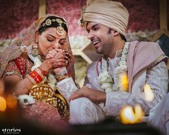 మరో పిక్చర్లో వధూవరులిద్దరూ పెళ్లి సంప్రదాయాలను పాటిస్తూ కనిపించారు. దాని క్యాప్షన్లో 'పంజాబీ మీట్ కశ్మీరీ' వెడ్డింగ్ అని పేర్కొంది. "మా పంజాబీ మీట్స్ కశ్మీరీ వెడ్డింగ్లో, మేం కేవలం జీలకర్ర, బెల్లం జోడించాం. సౌత్ ఇండియాతో మా ఇద్దరి వ్యక్తిగత బంధాలకు ఇది ఒక నీరాజనం. తెలుగు పెళ్లిలో, వధూవరుల కలయికను జీలకర్ర, బెల్లం తెలియజేస్తాయి. జీలకర్ర, బెల్లంను పేస్ట్లా చేసి, దాన్ని తమలపాకులో పెడతారు. పురోహితుడు వేద మంత్రాలను పఠిస్తుండగా, వధూవరులు దానిని పరస్పరం తమ తలలపై పెడతారు. ఈ తంతు పూర్తయ్యాకే వధూవరులు ఒకరినొకరు చూసుకుంటారు. కష్టసుఖాలన్నింటిలోనూ ఆ దంపతులు కలిసి మెలిసి ఉంటారని ఇది తెలియజేస్తుంది" అని ఆమె రాయడం విశేషం. తెలుగువారి పెళ్లి తంతు ఆమెకు అంతగా నచ్చిందన్న మాట!