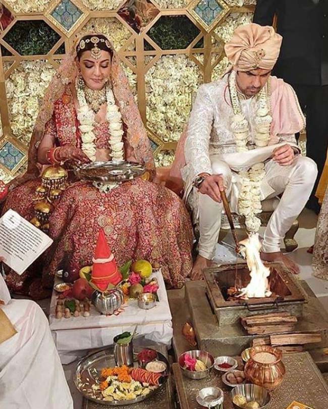 టాలీవుడ్ చందమామ కాజల్ అగర్వాల్ అక్టోబర్ 30 రాత్రి బిజినెస్మ్యాన్ గౌతమ్ కిచ్లును పెళ్లాడిన విషయం విదితమే. అనామికా ఖన్నా డిజైన్ చేసిన గోల్డెన్ ఎంబ్రాయిడరీ లెహంగా, ఆనియన్ పింక్ దుపట్టాతో కాజల్ మెరిసిపోగా, అనితా డోంగ్రే డిజైన్ చేసిన వైట్ షేర్వాణీలో గౌతమ్ ఆకట్టుకున్నాడు. కాగా పంజాబీ అయిన కాజల్, కశ్మీరీ అయిన గౌతమ్ తెలుగు సంప్రదాయం ప్రకారం జీలకర్ర బెల్లంతో పెళ్లి చేసుకోవడం విశేషంగా చెప్పుకోవాలి.