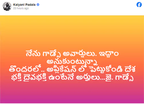 అలాగే 2014లో నాకు ప్రకటించిన నంది అవార్డులు ఇంకా ఇవ్వలేదు అవి ఇంక రావని కూడా తెలుసు. కళాకారులకి గద్దర్ పేరున ఇచ్చే అవార్డులు కూడా దండగే అని కూడా ఆమె అంది. ఆమె తన ఫేస్ బుక్ ద్వారా ఈ వ్యాఖ్యలు చేసింది. ప్రస్తుతం కరాటే కళ్యాణి చేసిన ఈ వ్యాఖ్యలు రెండు తెలుగు రాష్ట్రాల్లో సంచలనం సృష్టిస్తున్నాయి.ఈ విషయంలో కల్యాణిని కొంత మంది విమర్శిస్తుంటే మరికొంత మంది మాత్రం సపోర్ట్ గా మాట్లాడుతున్నారు.