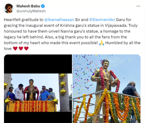 తన తండ్రి కృష్ణ విగ్రహాన్ని కమల్ హాసన్ ఆవిష్కరించడం పట్ల మహేష్ బాబు సోషల్ మీడియా వేదికగా తన సంతోషాన్ని వ్యక్తం చేశాడు. "విజయవాడలో కృష్ణగారి విగ్రహావిష్కరణ కార్యక్రమానికి హాజరైనందుకు కమల్ హాసన్ గారికి, దేవినేని అవినాష్ గారికి హృదయపూర్వక కృతజ్ఞతలు. నాన్నగారి విగ్రహాన్ని ఆవిష్కరించడం నిజంగా గర్వకారణం, ఆయన వదిలి వెళ్లిన వారసత్వానికి నివాళులు. అలాగే, ఈ ఈవెంట్ను సాధ్యం చేసిన అభిమానులందరికీ నా హృదయపూర్వక ధన్యవాదాలు." అని మహేష్ సోషల్ మీడియాలో రాసుకొచ్చారు.