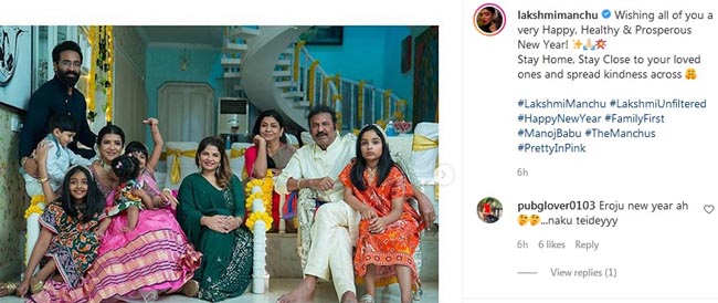 కాగా ఈ దీపావళి సందర్భంగా పిల్లలు, పెద్దలు కలిసి దిగిన ఫొటోలను లక్ష్మీ మంచు తన ఇన్స్టాగ్రామ్ హ్యాండిల్లో షేర్ చేశారు. ఆమె, ఆమె కుమార్తె విద్యా నిర్వాణ పింక్ డ్రస్సుల్లో మెరిసిపోయారు. నవంబర్ 14 దీపావళి మాత్రమే కాదు, జవహర్ లాల్ నెహ్రూ జయంతి సందర్భంగా జరుపుకొనే బాలల దినోత్సవం కూడా. అందుకే కూతురితో కలిసి డాన్స్ చేసిన చిన్న వీడియోను కూడా లక్ష్మి షేర్ చేశారు. విద్యా నిర్వాణకు తల్లిగా ఎంతో ఆనందాన్ని అనుభవిస్తున్నానని ఆమె పేర్కొన్నారు. ఈ సందర్భంగా కుమార్తెకు ఆమె థాంక్స్ కూడా చెప్పారు. అలాగే తల్లిదండ్రులు నిర్మల, మోహన్బాబు, సోదరుడు విష్ణు, ఆయన భార్య విరానిక, పిల్లలతో కలిసి తీయించుకున్న ఫొటోలను ఆమె షేర్ చేశారు. అయితే ఈ ఫొటోలకు న్యూ ఇయర్ విషెస్ను క్యాప్షన్గా పెట్టడంతో చాలా మంది ఆశ్చర్యపోయారు. ఎందుకంటే మనం ఇంకా నవంబర్లోనే ఉన్నాం. నూతన సంవత్సరానికి ఒకటిన్నర మాసం సమయం ఉంది. అయినప్పటికీ "Wishing all of you a very Happy, Healthy & Prosperous New Year! Stay Home, Stay Close to your loved ones and spread kindness across" అంటూ ఆమె రాసుకొచ్చారు.