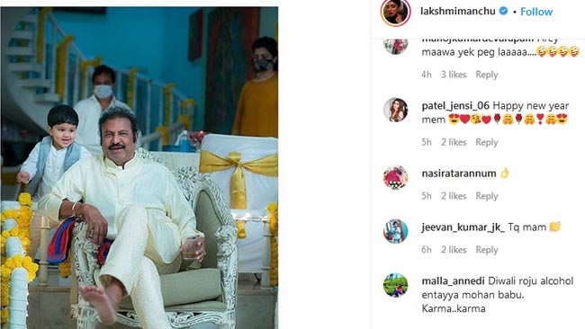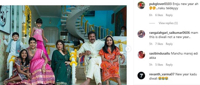 దీంతో కామెంట్స్ సెక్షన్లో పలువురు దీన్ని ప్రస్తావించి, "న్యూ ఇయర్ కాదమ్మా దీపావళి శుభాకాంక్షలు" అంటూ కామెంట్ చేశారు. ఒకరు "ఈరోజు న్యూ ఇయరా.. నాకు తెలీదే" అని కామెంట్ చేస్తే, ఇంకొకరు "మేడమ్ ఇది దీపావళి.. న్యూ ఇయర్ కాదు" అని చెప్పారు. కాగా మోహన్బాబు చేతిలో డ్రింక్ ఉన్న గ్లాస్ కనిపించడంతో.. ట్రోల్ కూడా చేశారు. ఒకరు "అరేయ్ మావా ఏక్ పెగ్లా" అని రాస్తే, మరొకరు "దీవాలీ రోజు ఆల్కహాల్ ఏంటయ్యా మోహన్బాబు" అని కామెంట్ పెట్టారు.