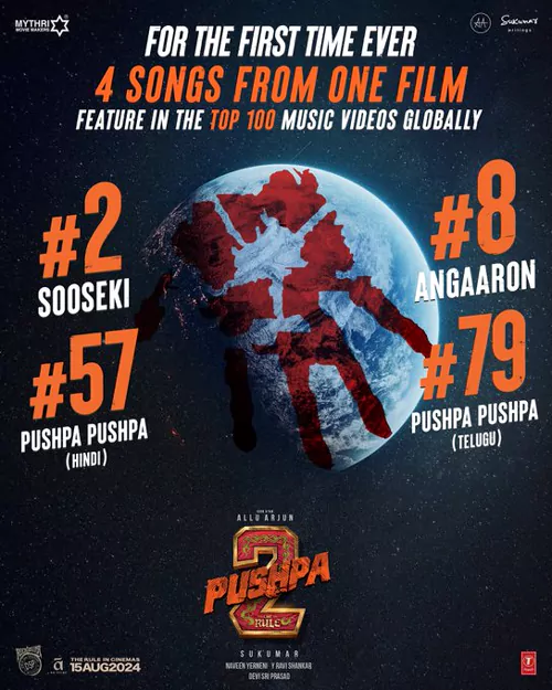 రీసెంట్ గా పుష్ప కి సంబంధించి సూసేకి సాంగ్ రిలీజ్ అయ్యింది. ఇప్పుడు ఎక్కడ చూసినా ఈ పాటనే మారుమోగిపోతూ ఉంది. అంతకు ముందు విడుదలైన పుష్ప పుష్ప సాంగ్ కూడా మంది ఆదరణ పొందింది అది ఎంతలా అంటే ప్రపంచవ్యాప్తంగా యూట్యూబ్ టాప్ 100 మ్యూజిక్ వీడియోస్ జాబితాలో ఏకంగా నాలుగు పాటలు పుష్ప 2 లోనివే ఉండేలా సూసేకి సాంగ్ 2వ ప్లేస్ లో, అంగారో 8వ ప్లేస్ లో ఉండగా,పుష్ప పుష్ప హిందీ సాంగ్ 57వ ప్లేస్ లో, ఇదే పాట తెలుగు