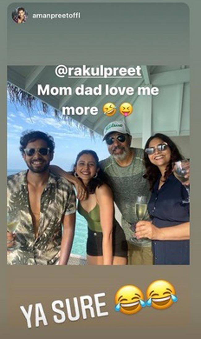 అంతకుముందు తన ఫ్యామిలీతో పాటు ముంబై ఎయిర్పోర్ట్లో దర్శనమిచ్చిన ఆమె, మాల్దీవుల్లో వారితో కలిసి దిగిన ఫొటోను సైతం తన ఇన్స్టాగ్రామ్ స్టోరీలో షేర్ చేసింది. ఆ ఫొటోలో ఆమె అమ్మానాన్నలతో పాటు తమ్ముడు అమన్ప్రీత్ కూడా ఉన్నాడు. ఆ ఫొటోకు "మామ్ డాడ్ లవ్ మి మోర్" అనే క్యాప్షన్ పెట్టింది.
