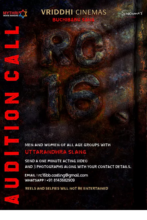 ఇదిలా ఉండగా.. ఈ సినిమాకి సంబంధించి ఓ బంపర్ ఆఫర్ ఇవ్వబోతోంది చిత్ర యూనిట్. కొత్త నటీనటులకు అవకాశం కల్పిస్తోంది. దీనికి సంబంధించిన ఆడిషన్స్ కోసం ఆహ్వానం పలుకుతూ ఓ పోస్టర్ విడుదల చేసింది మైత్రి మూవీ మేకర్స్ సంస్థ. అన్ని వయసుల వారికి అవకాశం ఈ సినిమాలో నటించే అవకాశం ఉంది. అయితే ఉత్తరాంధ్ర గ్రామీణ భాష బాగా తెలిసిన వారికి మొదటి ప్రాధాన్యం ఇవ్వబోతున్నారు. నటీనటులు తాము నటించిన ఒక నిమిషం వీడియో, మూడు ఫోటోలు మెయిల్కి కానీ, వాట్సప్ నంబర్కు కానీ పంపాలంటూ సంస్థ పేర్కొంది. రామ్చరణ్ సినిమాలో నటించాలన్న ఆసక్తి ఉన్నవారు, ఉత్తరాంధ్ర భాష బాగా తెలిసిన వారుంటే.. ఆలస్యం చేయకుండా మైత్రి మూవీ మేకర్స్ సంస్థ పేర్కొన్న మెయిల్కు, వాట్సాప్కు వీడియో, ఫోటోలు పంపించవచ్చు. ఆడిషన్స్ పూర్తయిన తర్వాత ఈ సినిమా సెట్స్పైకి వెళ్లబోతోంది. వచ్చే ఏడాది మార్చిలో ఈ సినిమా షూటింగ్ మొదలవుతుంది. 2025 సమ్మర్లో చిత్రాన్ని విడుదల చేయడానికి ప్లాన్ చేసింది చిత్ర యూనిట్.