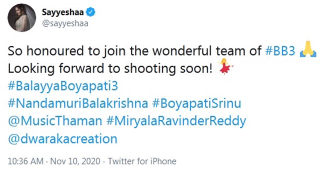 నటసింహం నందమూరి బాలకృష్ణ కథానాయకుడిగా ఊర మాస్ కమర్షియల్ చిత్రాల దర్శకుడు బోయపాటి శ్రీను తెరకెక్కిస్తున్న తాజా చిత్రంలో కథానాయిక ఎంపిక పూర్తయింది. ఇందులో బాలయ్య సరసన తమిళ కథానాయకుడు ఆర్య సతీమణి సాయేషా సైగల్ నటించనున్నారు. ఈ విషయాన్ని చిత్ర నిర్మాణ సంస్థ ద్వారకా క్రియేషన్స్ మంగళవారం అధికారికంగా తెలియజేసింది. త్వరలో ఆమె చిత్రీకరణలో పాల్గొంటారని పేర్కొంది.