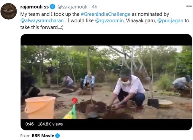 రామ్‌చ‌ర‌ణ్ నామినేట్ చేసిన విధంగా తాము గ్రీన్ ఇండియా చాలెంజ్‌ను స్వీక‌రించి మొక్క‌ల‌ను నాటిన‌ట్లు త‌న ట్విట్ట‌ర్ హ్యాండిల్ ద్వారా రాజ‌మౌళి తెలిపారు. డైరెక్ట‌ర్లు రామ్ గోపాల్ వ‌ర్మ‌, వినాయ‌క్‌, పూరి జ‌గ‌న్నాథ్ పేర్ల‌ను ఆయ‌న నామినేట్ చేశారు.