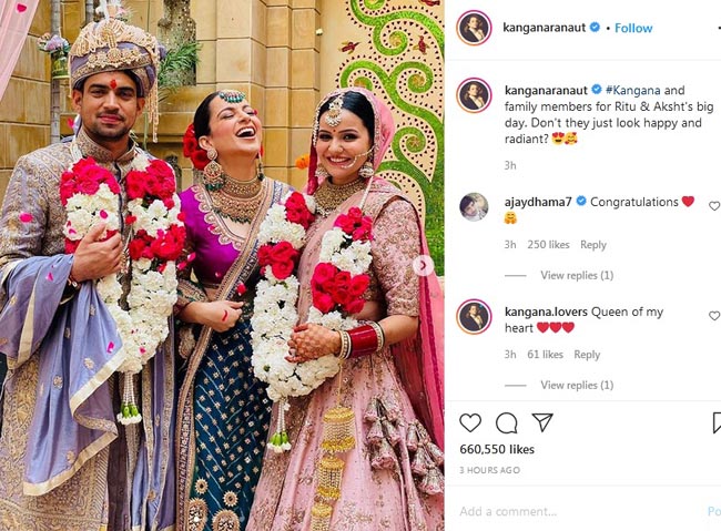 తన ట్విట్టర్, ఇన్స్టాగ్రామ్ హ్యాండిల్స్ ద్వారా సోదరుని పెళ్లికి సంబంధించిన ఫొటోలను ఆమె షేర్ చేశారు. ఒక పిక్చర్లో వధూవరుల మధ్య నిల్చొని బిగ్గరగా నవ్వుతున్న కంగన కనిపిస్తే, ఇంకో పిక్చర్లో సోదరునికి తలపాగా పెడుతున్న కంగన కనిపించారు. అక్క రంగోలి చద్దేలితో ఓ ఫొటో, అమ్మ-అక్కతో ఇంకో ఫొటో.. ఇలా పలు ఫొటోల్లో సెంటర్ ఆఫ్ ఎట్రాక్షన్ ఆమే. ఈ వేడుకలో ఆమె ధరించిన డ్రస్ కూడా అనేకమందిని ఆకట్టుకుంది. దాని గురించి కామెంట్ల సెక్షన్లలో పలువురు ఆమెను అడిగారు. దీనికి సమాధానం ఇచ్చారు కంగన.