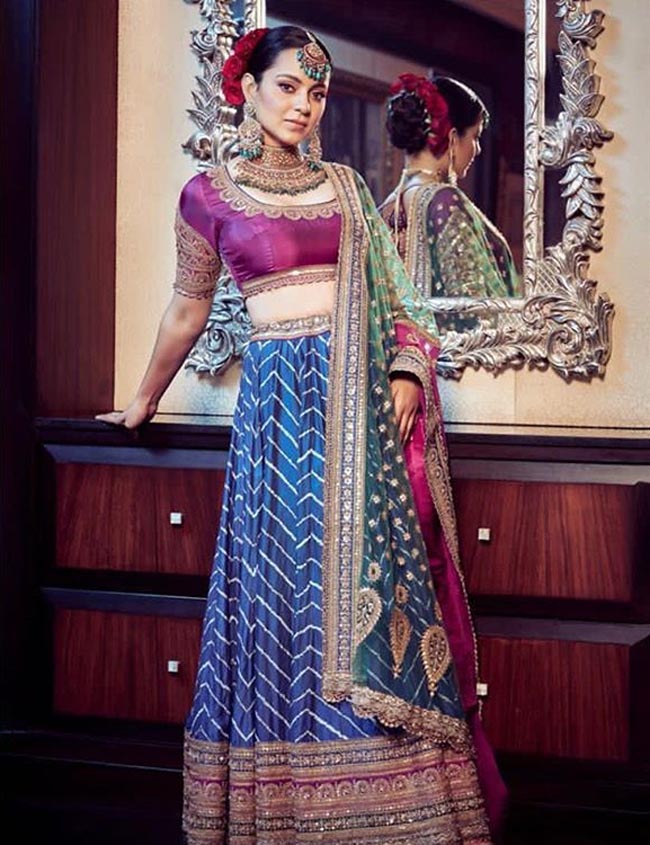 "నా లెహంగా గురించి అందరూ అడుగుతున్నారు. ఇది గుజరాతీ బంధని లెహంగా. దీన్ని తయారుచేయడానికి 14 నెలల సమయం పట్టింది. డిజైనర్ అనూరాధ వాల్మీకి ఈ కలను నిజం చేశారు. జ్యూయలరీని నా ఫ్రెండ్ సవ్యసాచి డిజైన్ చేశారు" అని తెలిపారు కంగన.