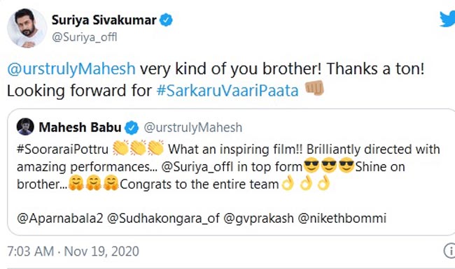 తెలుగు వెర్షన్ కాకుండా నేరుగా ఒరిజినల్ వెర్షన్ను 'సూరారై పొట్రు'ను చూసిన మహేశ్, “SooraraiPottru What an inspiring film!! Brilliantly directed with amazing performances... @Suriya_offl Shine on brother... Congrats to the entire team”. అని తన ట్వీట్లో ప్రశంసించాడు. వెంటనే సూర్య, “@urstrulyMahesh very kind of you brother! Thanks a ton! Looking forward for #SarkaruVaariPaata”. అని రిప్లై ఇచ్చాడు. సినిమాలో సూర్య భార్యగా నటించిన అపర్ణ, “Thank you so much sir”. అని ట్వీట్ చేసింది.