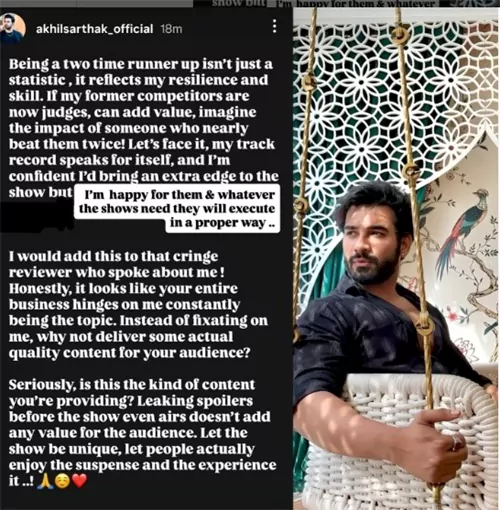 నా గురించి మాట్లాడిన ఆ దొంగ రివ్యూవర్ కోసమే నేను ఈ కామెంట్ ని రాస్తున్నాను. మీ మొత్తం బిజినెస్ నా మీద డిపెండ్ అయినట్లే కనిపిస్తోంది. నాపై కాన్సంట్రేషన్ చేయడం మానేసి ఆడియన్స్ కి ఏది అవసరమో ఆ క్వాలిటీ కంటెంట్ ని ఎందుకు అందించలేకపోతున్నావ్ ? ఇలాంటి వన్ సైడెడ్ కంటెంటా మీరు ఆడియన్స్ కి అందిస్తోంది. బిగ్ బాస్ షో స్టార్ట్ కావడానికి ముందే అన్ని విషయాలను లీక్ చేసేయడం వలన ఇక ఆడియన్స్ కి ఎం విలువ ఇస్తున్నట్లు ? షోని షోలా ఉండనివ్వండి. ఆడియన్స్ సస్పెన్స్ ని ఎంజాయ్ చేయాలని అనుకుంటారు కానీ అది మొత్తం ఎందుకు నాశనం చేస్తున్నావ్ ? " అంటూ ఒక ఘాటైన మెసేజ్ ని అఖిల్ సార్థక్ తన ఇన్స్టాగ్రామ్ పోస్ట్ లో పెట్టారు.