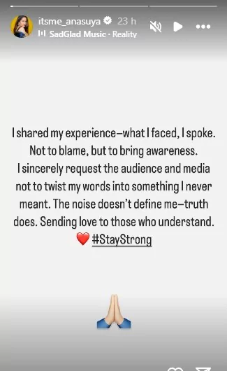 అనసూయ పెట్టే ట్వీట్స్ ఎప్పుడూ వైరల్ అవుతూ ఉంటాయి. రీసెంట్ గా ఆమె పెట్టిన ఒక ట్వీట్ కూడా అలాగే వైరల్ అయ్యింది. "నాకు ఎదురైన అనుభవాన్ని, నేను చూసిన సంఘటనలను మాత్రమే షేర్ చేసుకున్నా తప్ప ఎవరిని నేను బ్లేమ్ చేసే ఉద్దేశం లేదు. అందరికీ అవగాహన కల్పించడం కోసమే మాట్లాడాను. ఆడియన్స్ కి, మీడియాకి నేను రిక్వెస్ట్ చేస్తున్నది ఒక్కటే దయచేసి ఎవరూ కూడా నా మాటలను వక్రీకరించి, నేను అనని మాటలను నేను అన్నట్టు ట్రోల్ చేయొద్దు. ఎప్పటికైనా నిజమే గెలుస్తుంది. నన్ను అర్థం చేసుకున్న వారికి మాత్రమే నా ప్రేమను అందిస్తాను..