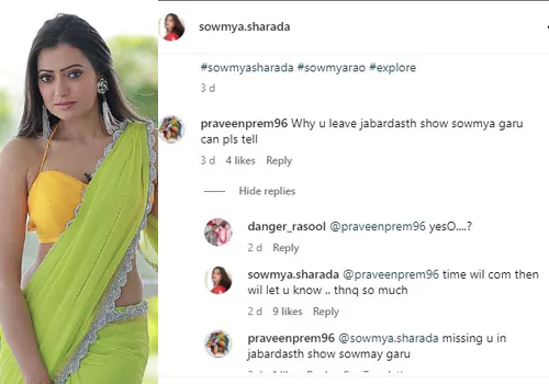 మీరు ఏదో షో కోసం అన్నట్టుగా చేయకుండా చాలా జెన్యూన్ గా ఆడియన్స్ కోసం నేచురల్ గా చేస్తారు. మిమ్మల్ని బుల్లి తెర మీద మిస్ అవుతున్నాం.. కానీ మీకంతా మంచి జరగాలని కోరుకుంటున్నా...వెండితెర మీద మంచి ఛాన్సెస్ రావాలని విష్ చేస్తున్న" అని అన్నారు. ఐతే హైపర్ ఆదికి ఎదురు పంచులు వేస్తోందని సౌమ్యను యాంకర్గా తీసేసారా ? సౌమ్యనే వెళ్లిపోయిందో ఇంతవరకు తెలీదు. ఎందుకంటే ఈ షో నుంచి ఎలాంటి ముందస్తు ఇన్ఫర్మేషన్ లేకుండానీ ఆమె వెళ్ళిపోయింది. ఆ కారణం ఇప్పటివరకు ఎవరూ కూడా రివీల్ చేయలేదు. ఈమెను తప్పించడం వెనుక ఎవరున్నారు ? మల్లెమాల టీం నిర్ణయమా... జబర్దస్త్ డైరెక్షన్ టీం నిర్ణయమా... ? ఎవ్వరికీ తెలియదు. ఆ నెటిజన్ కి సౌమ్య ఇలా రిప్లై ఇచ్చింది. " టైం వచ్చినప్పుడు అన్నీ చెప్తా.. థాంక్యూ సో మచ్ " అని చెప్పింది . అంటే జబర్దస్త్ షోకు సౌమ్య దూరం అవ్వడం వెనక పెద్ద తతంగమే ఉన్నట్టుగా కనిపిస్తోంది. మరి సౌమ్య ఎప్పుడు నోరు విప్పుతుందో.. ఆ టైం ఎప్పుడు వస్తుందో ఆ దేవుడికే తెలియాలి.