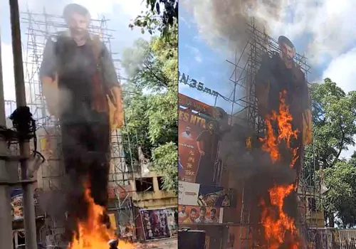 జూనియర్ ఎన్టీఆర్ (Jr NTR) హీరోగా నటించిన పాన్ ఇండియా మూవీ 'దేవర' (Devara) భారీ అంచనాల నడుమ నేడు థియేటర్లలో అడుగుపెట్టింది. తెలుగు నాట ప్రతి థియేటర్ వద్ద పండగ వాతావరణం నెలకొంది. ముఖ్యంగా హైదరాబాద్లోని సుదర్శన్ థియేటర్ వద్ద భారీ కటౌట్ ను ఏర్పాటు చేసి, ఫ్యాన్స్ పెద్ద ఎత్తున సెలబ్రేట్ చేశారు. అయితే అక్కడ ఏర్పాటు చేసిన భారీ కటౌట్ ఒక్కసారిగా తగలబడిపోవడం హాట్ టాపిక్ అయింది. సినిమా నచ్చకపోవడంతో ఆ ఫ్రస్ట్రేషన్ లో ఎన్టీఆర్ ఫ్యాన్స్ కటౌట్ ను తగలబెట్టారంటూ కొన్ని సెకన్ల వీడియో క్లిప్ ని కొందరు సోషల్ మీడియాలో వైరల్ చేశారు. దీంతో చాలామంది దీనిని నిజమని నమ్ముతున్నారు. అయితే అసలు దీని వెనక జరిగింది వేరు. దేవర చూసిన ఆనందంలో.. సినిమా బ్లాక్ బస్టర్ అంటూ అభిమానుల కటౌట్ ముందు భారీగా టపాసులు కాల్చారు. ఈ క్రమంలో అనుకోకుండా కటౌట్ కి నిప్పు అంటుకొని చూస్తుండగానే ఒక్కసారిగా కాలి పోయింది. అక్కడున్న అభిమానులు మంటలు ఆర్పే ప్రయత్నం చేసినప్పటికీ.. చెక్క కావడంతో క్షణాల్లోనే దగ్దమైంది. ఈ మొత్తం వీడియోని సోషల్ మీడియాలో పోస్ట్ చేసి, అసలు నిజాన్ని బయటపెట్టారు ఎన్టీఆర్ ఫ్యాన్స్.