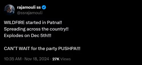 పాట్నాలో జరిగిన 'పుష్ప-2' ట్రైలర్ లాంచ్ పై రాజమౌళి సోషల్ మీడియా వేదికగా స్పందించారు. "పాట్నాలో వైల్డ్ ఫైర్ మొదలైంది. అది దేశమంతటా విస్తరిస్తోంది. డిసెంబర్ 5న భారీ పేలుడు సంభవించనుంది. పార్టీ కోసం వేచి ఉండలేకపోతున్నాను పుష్ప." అంటూ రాజమౌళి తనదైన శైలిలో ట్వీట్ చేశారు.